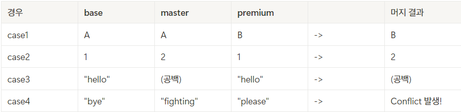 - base에서 변화가 발생한 2가 머지 결과가 됨