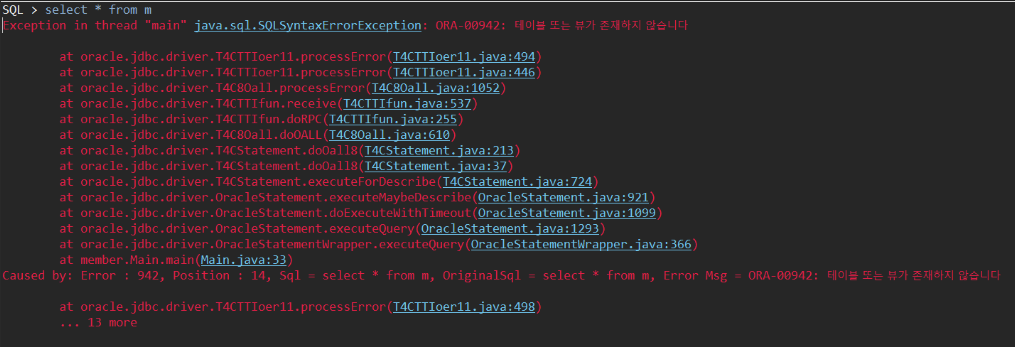 - select * from m (error가 발생해도 사진과 같이 '테이블 또는 뷰가 존재하지 않습니다' 와 같은 에러를 자세하게 알려준다)