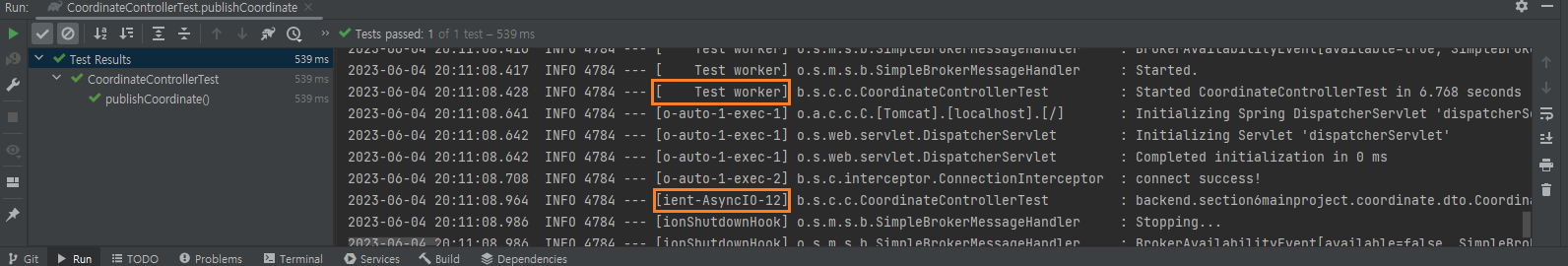 웹소켓이 동작하는 스레드는 테스트가 동작하는 스레드와 다르다.