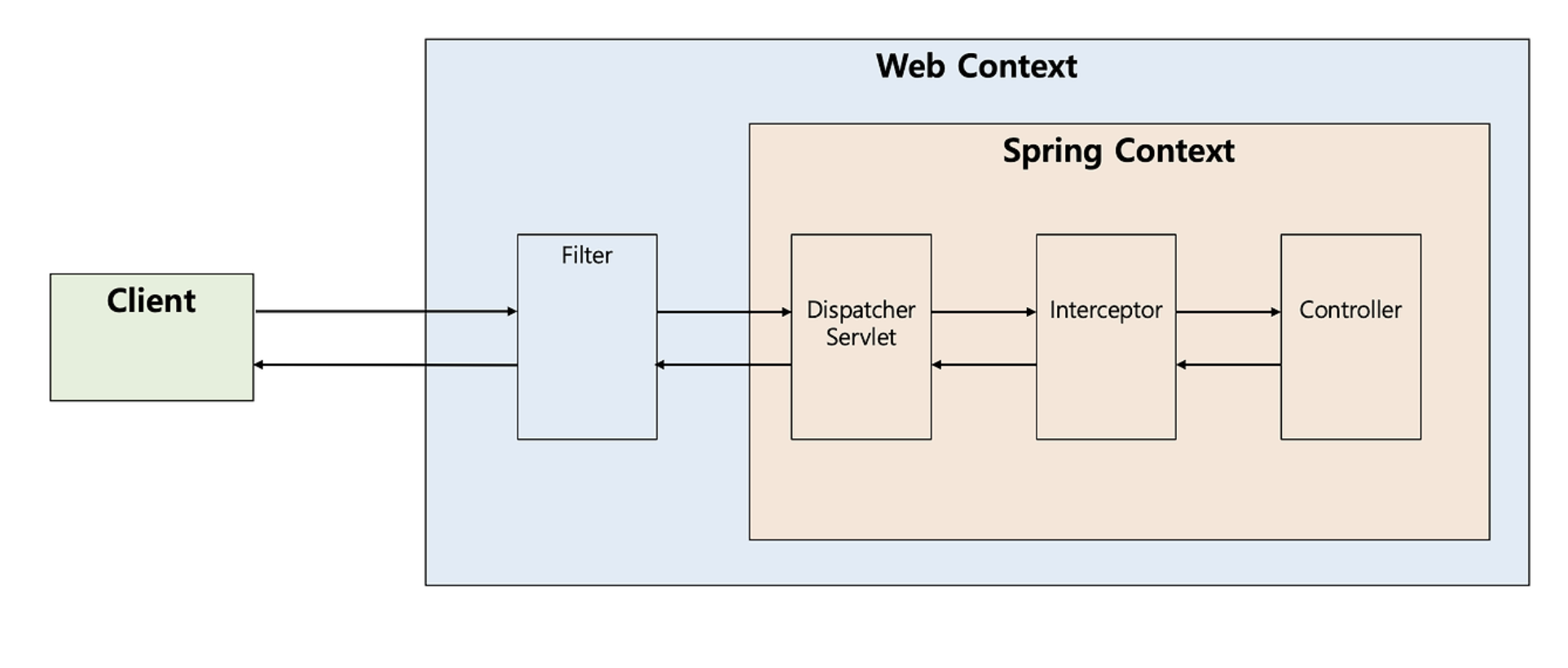 Interceptor 는 DispatcherServlet 이후에 동작하며 Spring 컨텍스트에 접근 할 수 있다.