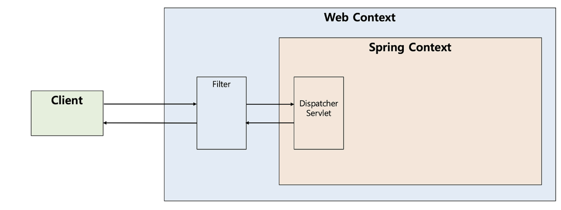 Filter 는 Spring Context 밖에 위치하며 웹 컨텍스트에 존재한다.