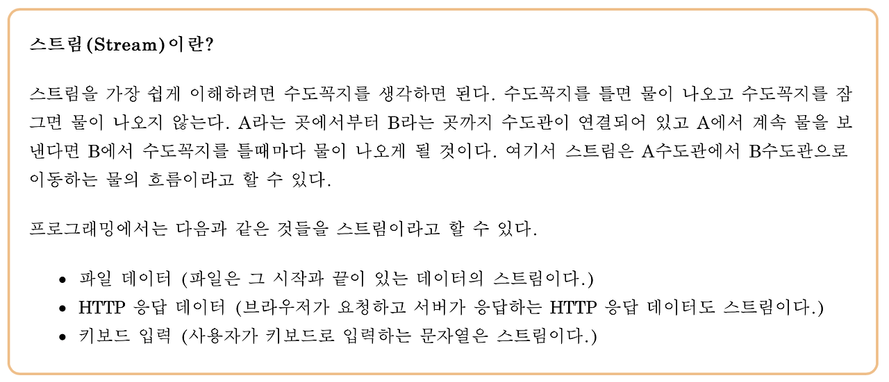 여기서 스트림은 파일을 읽거나 쓸 때, 데이터가 전송되는 통로라고 생각하면 좋을 것 같다.