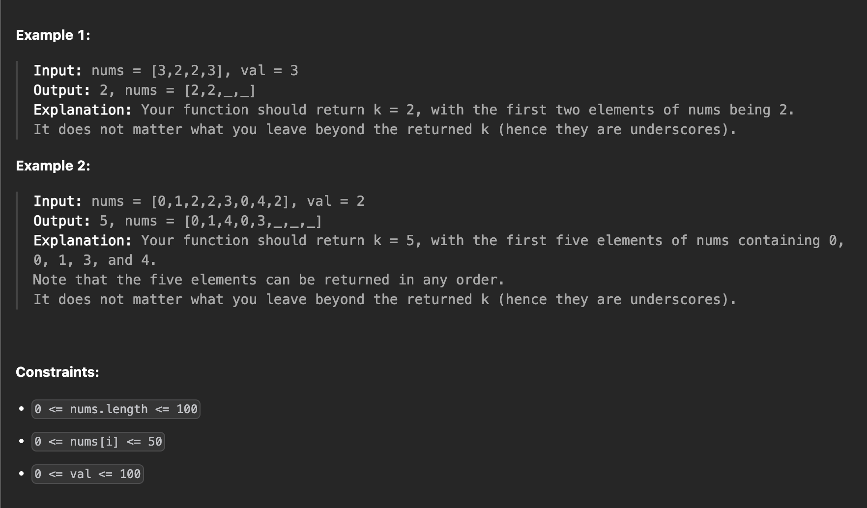 0 번째 요소 3은 val과 일치한다.[2,2,2,3]1 번째 요소 2은 val과 일치하지 않는다.1 번째 요소 2를 0 번째에 할당한다. [2,2,2,3]2 번째 요소 2은 val과 일치하지 않는다.2 번째 요소 2를 1 번째에 할당한다. [2,2,2,3]3 번째 요소 3은 val과 일치하지 않는다.[2,2,2,3]리턴할 때 중요한건 k의 값이 무엇인지와 0번째 부터 ~ k번째 까지 요소가 무엇인가이다. 즉, 배열 nums가 [2,2,2,3]건 [2,2]건 [2,2,10000000 ...]건 전혀 상관이 없다.