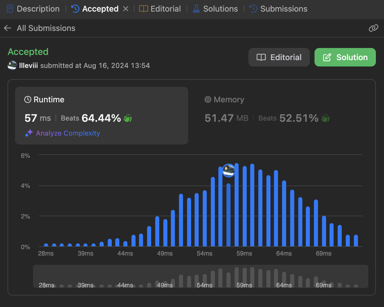 위와 같이 코드를 짜니 테스트 케이스와 submit했을 때 모든 케이스에 통과하였다.