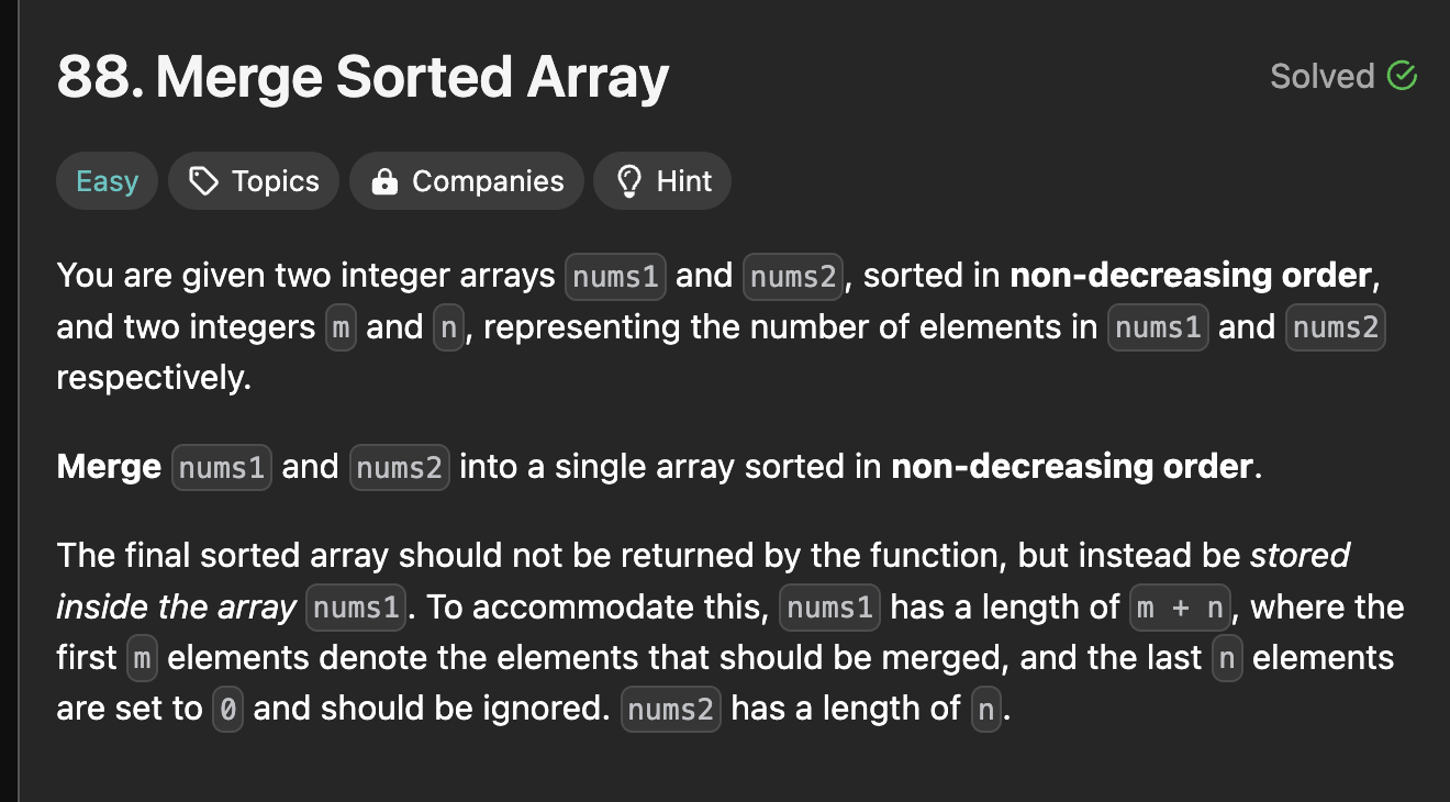non-decreasing-order는 현재 요소가 이전 요소보다 "작지 않은 것" => 동일하거나 큰 것increasing-order는 현재 요소가 이전 요소보다 "큰 것"To accommodate this, nums1 has a length of m + n, where the first m elements denote the elements that should be merged, and the last n elements are set to 0 and should be ignored. nums2 has a length of n.