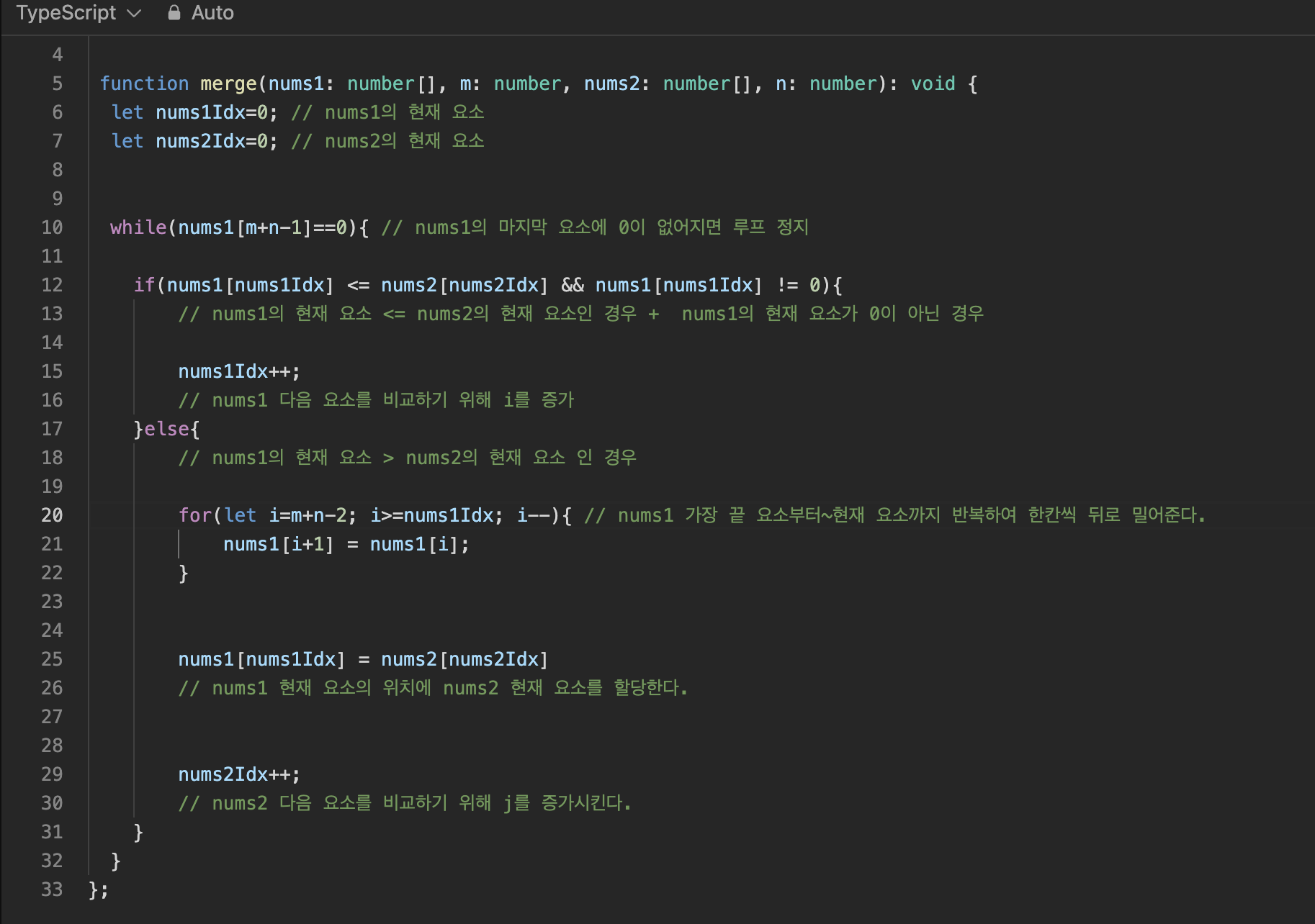 nums1의 현재 요소가 nums2의 현재 요소보다 큰 경우 (else 조건)nums1 현재 요소의 인덱스 위치에 nums2 현재 요소를 할당하고, nums1 현재 요소를 뒤로 한칸씩 밀어내야한다.nums1을 새로 만들지 않고, 배열 안 요소들을 변경하여 위 조건을 충족해야한다. nums1의 요소들 중 뒷 부분에 위치한 0은 없어져야 하는 요소들이니,