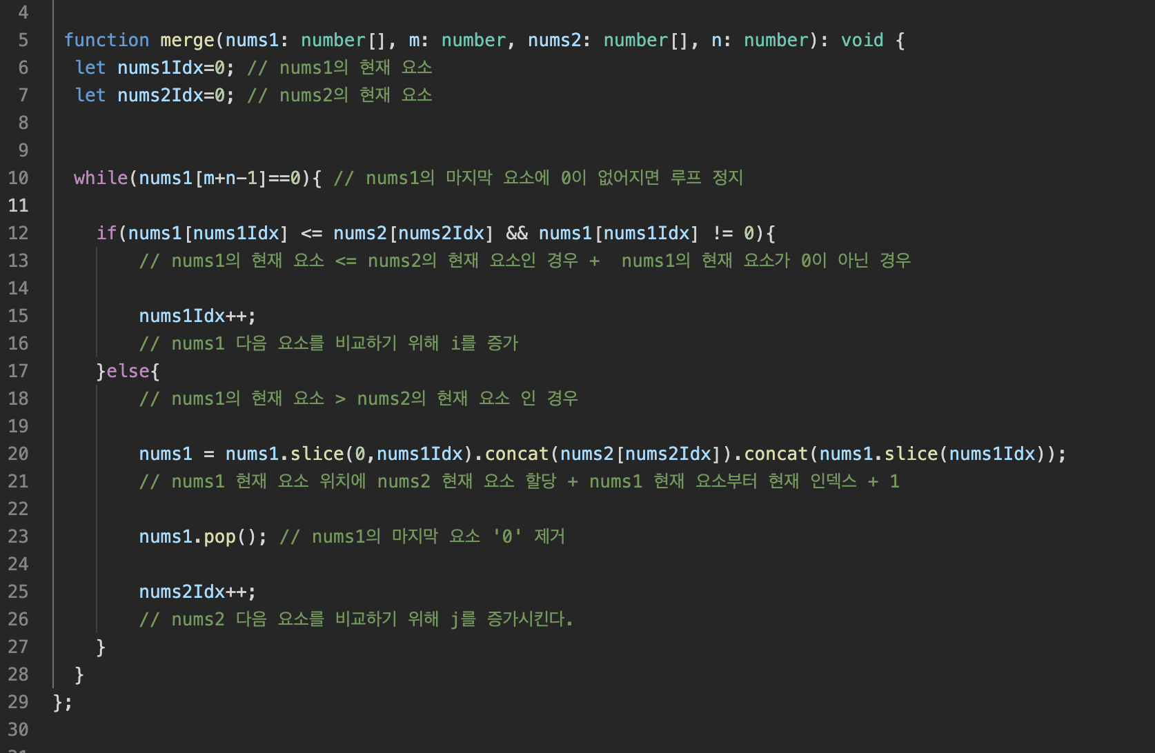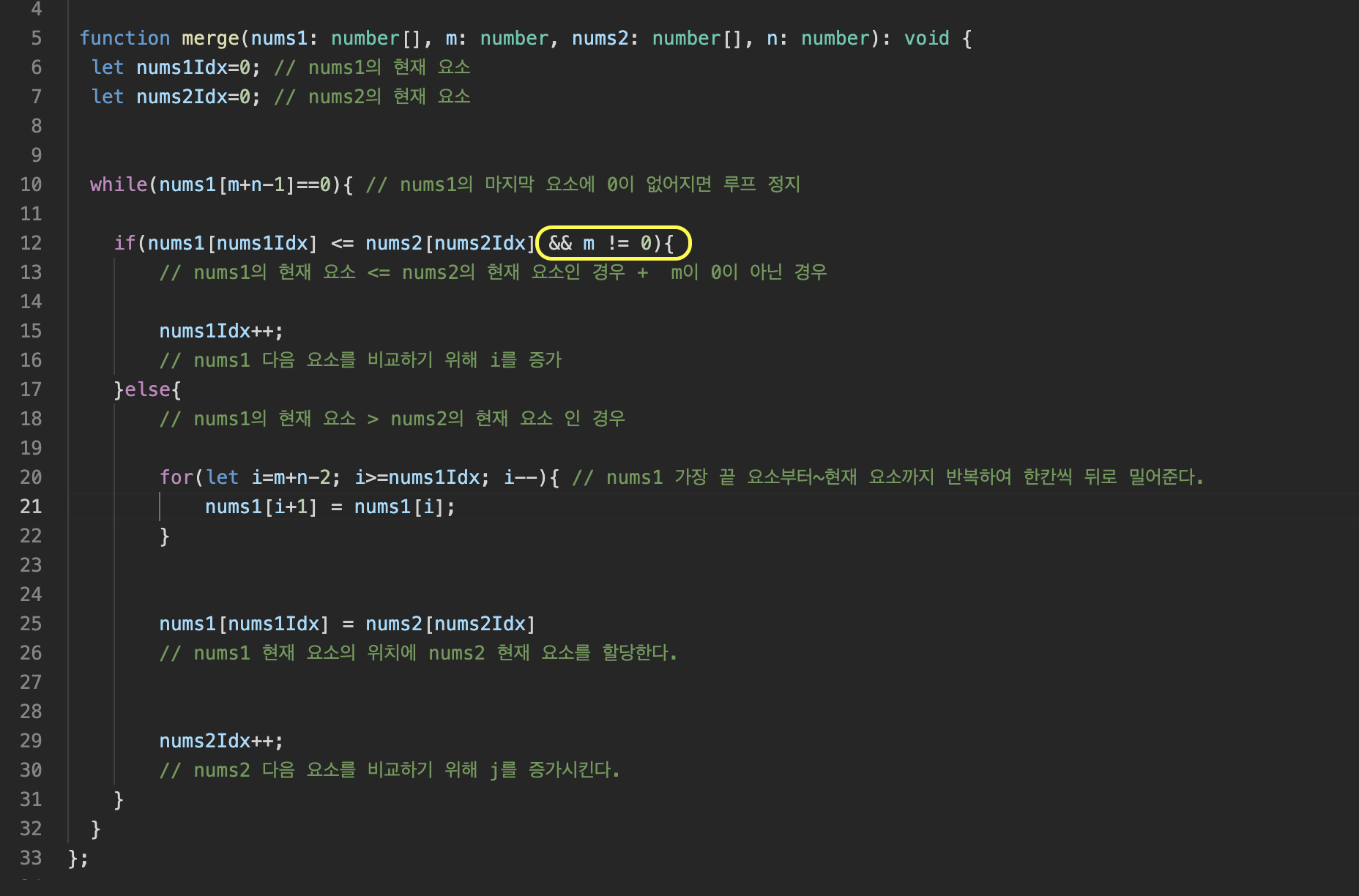반복 루프를 돌며 각 요소들을 비교&처리 해주고, nums2의 요소가 nums1의 '0'부분들을 전부 채워주었을 때 루프를 멈추기로 했다.