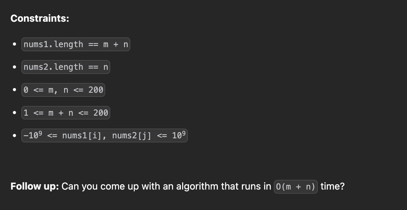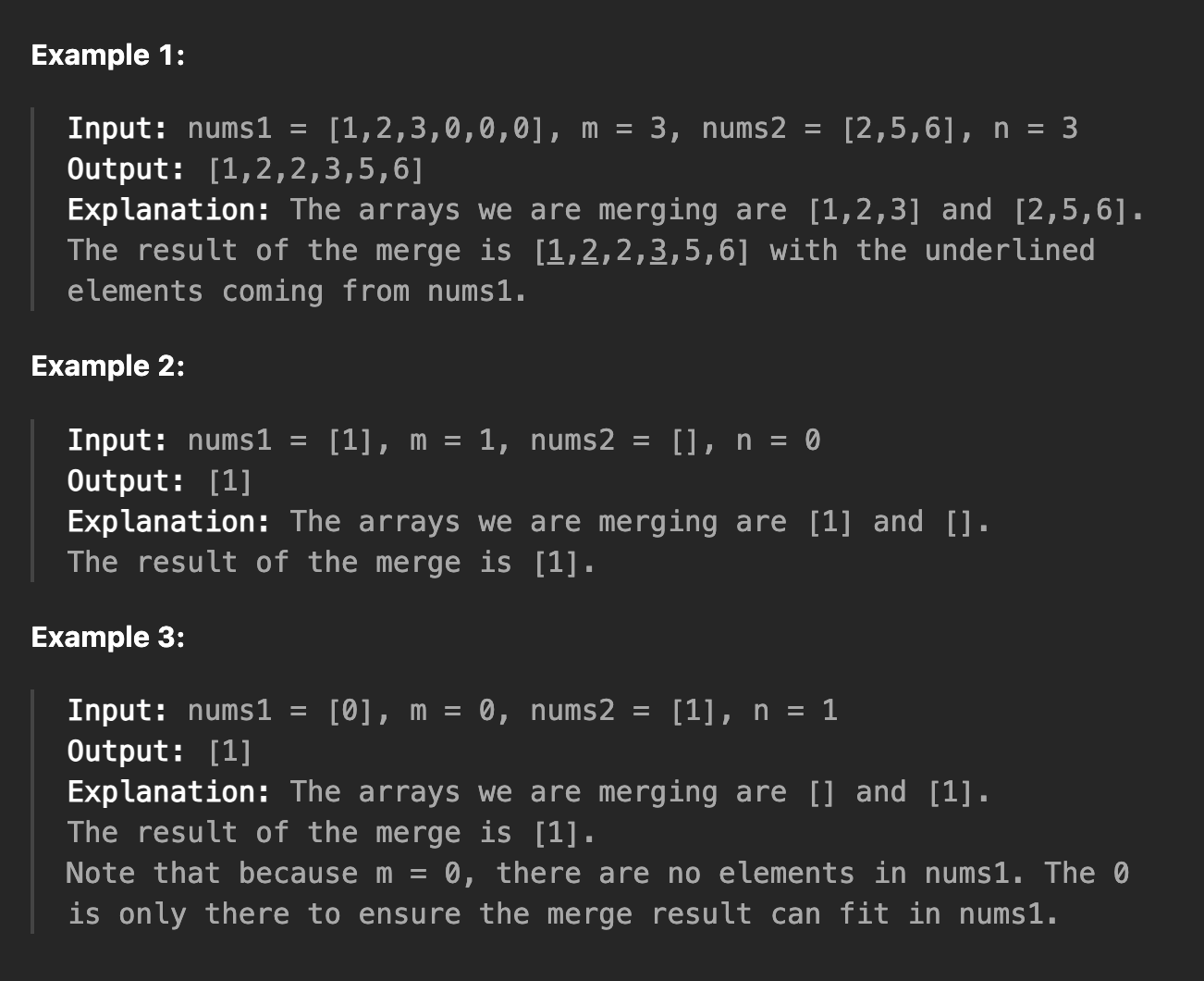 non-decreasing-order로 정렬될 배열 nums1과 nums2를 받는다. m과 n을 받는다. m은 배열 nums1의 요소의 수를 나타낸다. n은 배열 nums2의 요소의 수를 나타낸다. nums1과 배열 nums2을 하나로 합쳐라 (non-decreasing-order)제약 사항
