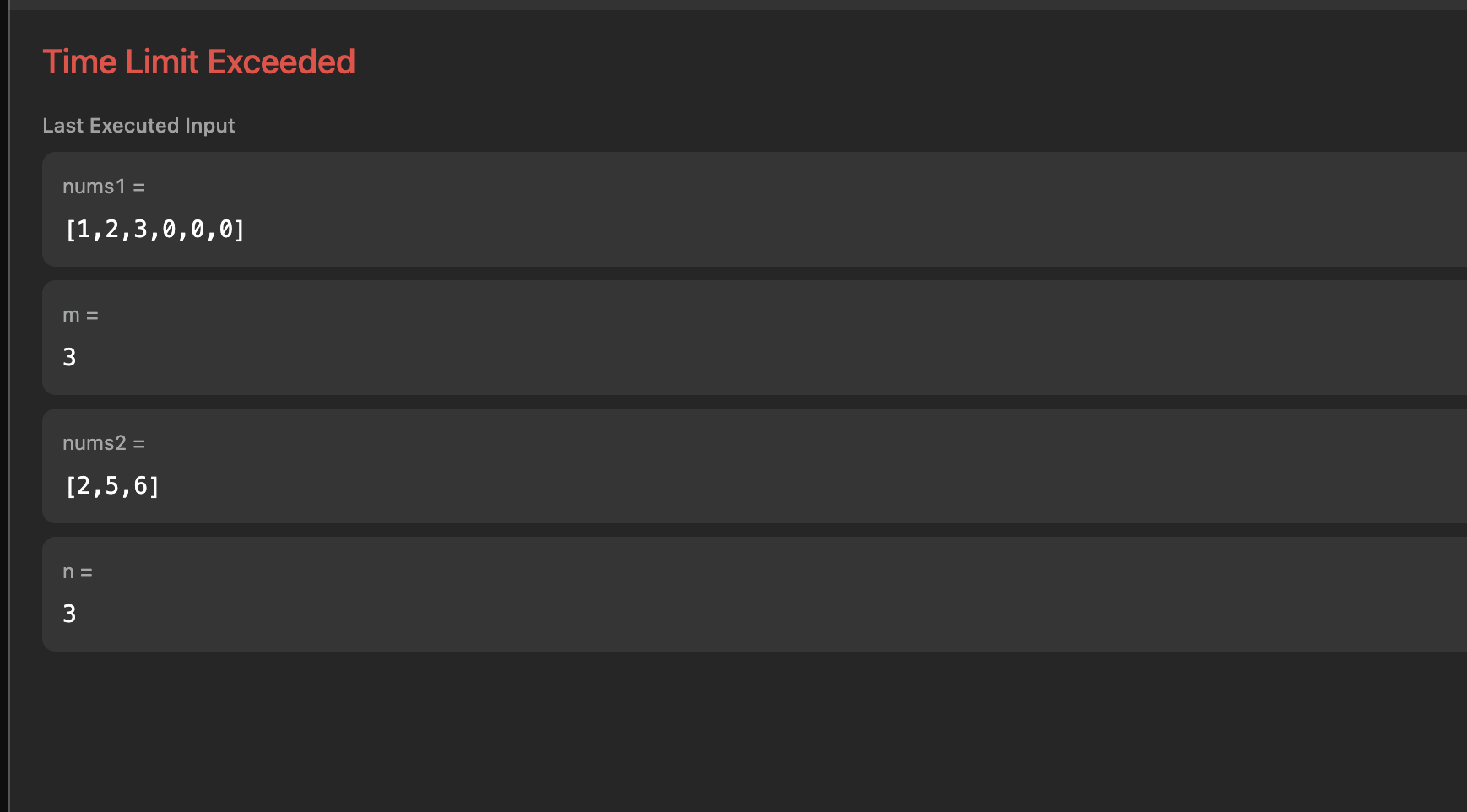 nums1이 1,2,3,0,0,0 이고 nums2가 [2,5,6]인 경우 루프를 탈출하지 못한다.