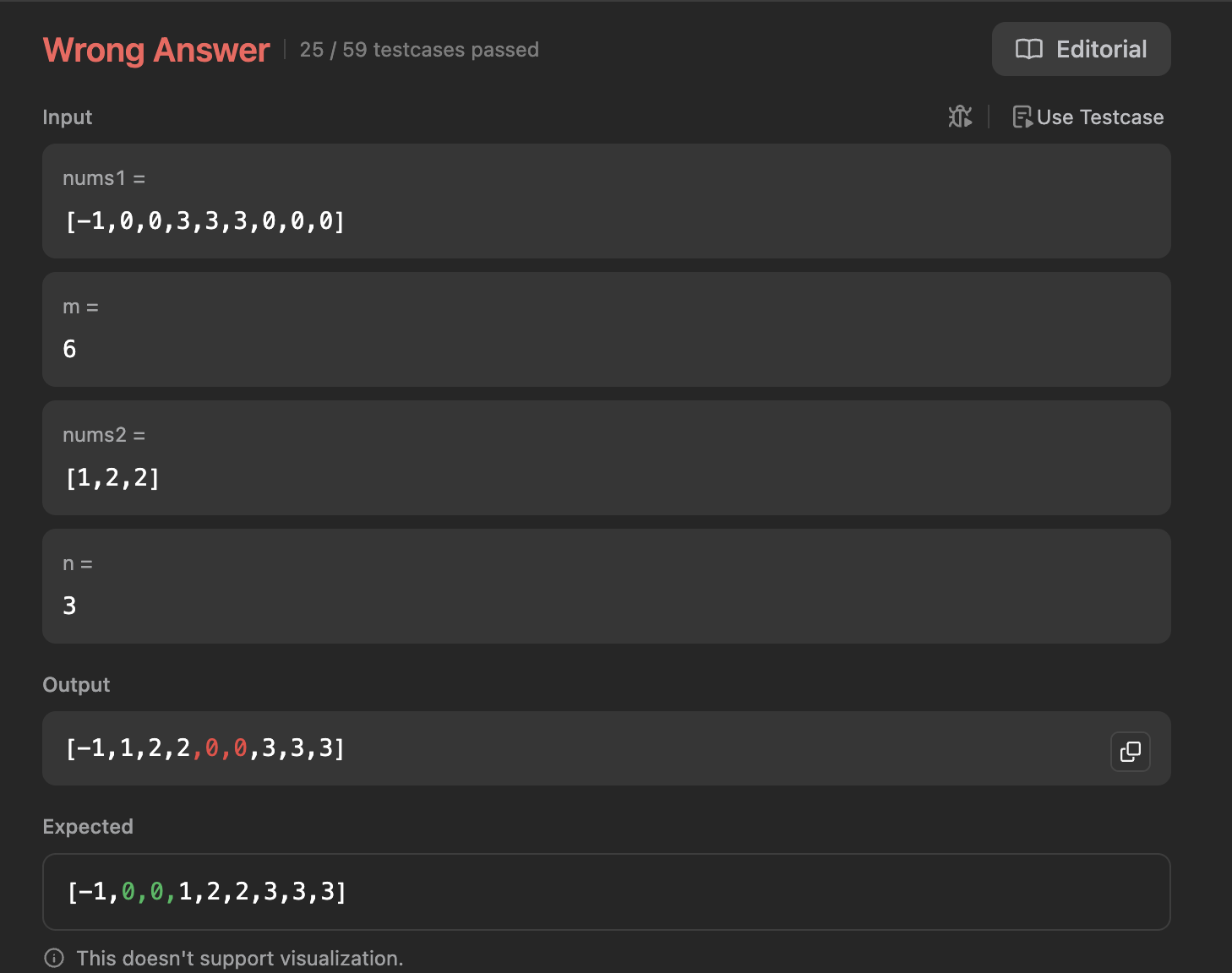 nums1=[0] 인 경우를 경우를 충족하면서 동시에 nums1이 [-1,0,0,3,3,3,0,0,0]인 케이스 들도 충족시키기 때문이었다.