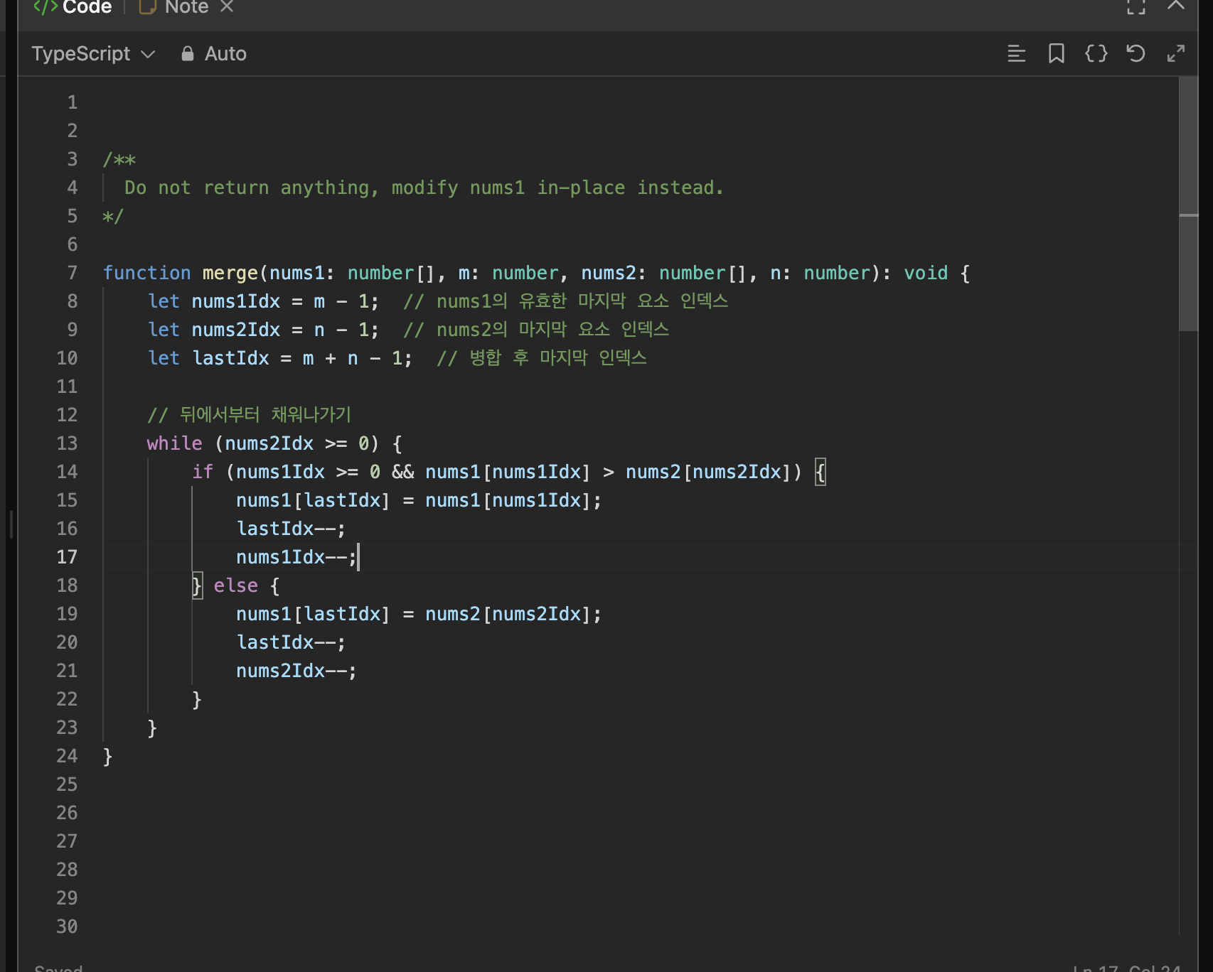 위 말은 정수 n이 nums2의 요소 길이를 나타냄과 동시에 nums1에서 채워지지 않는 부분을 나타낸다는 것을 이해하는데 시간이 꽤 소요되었다.