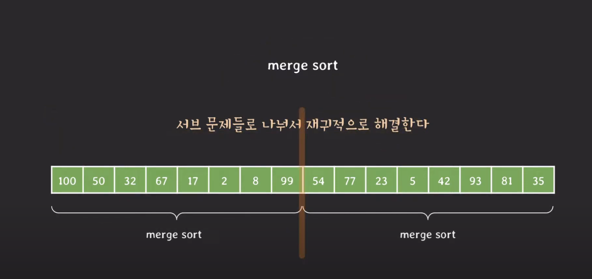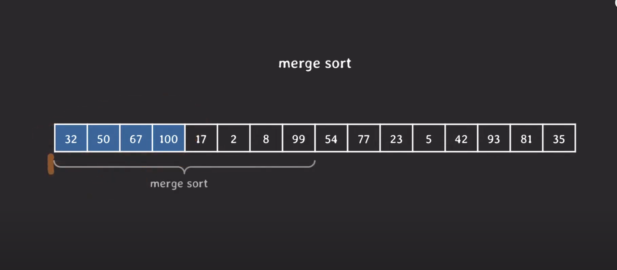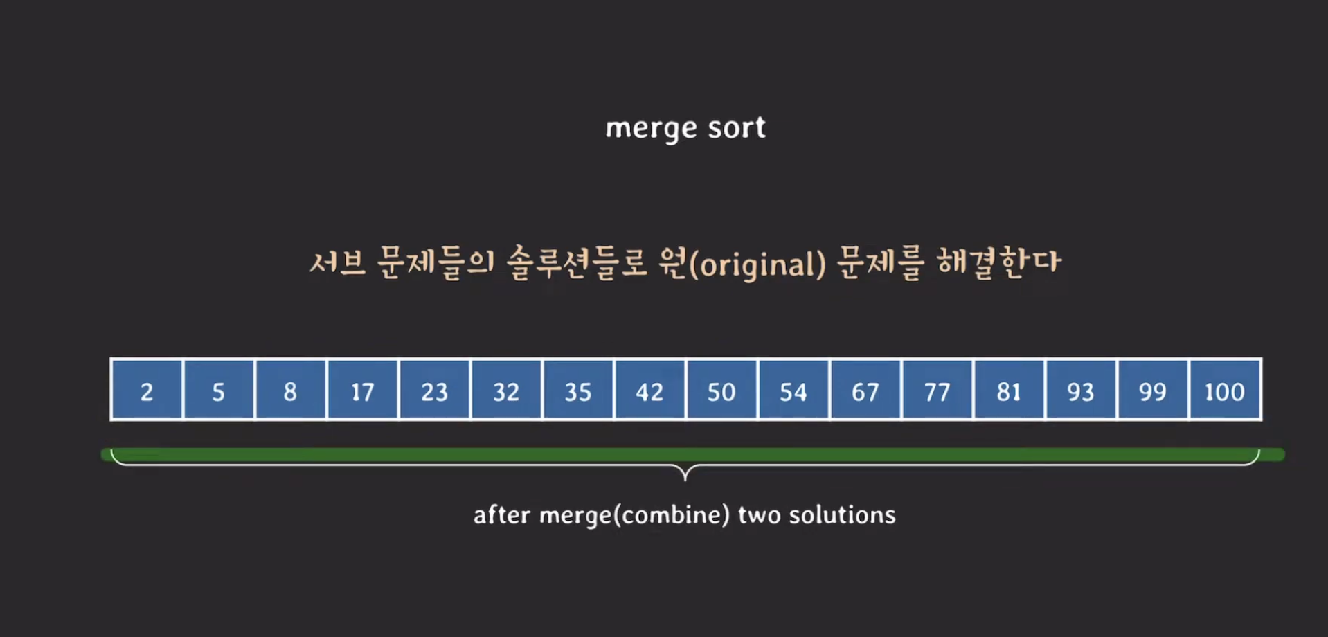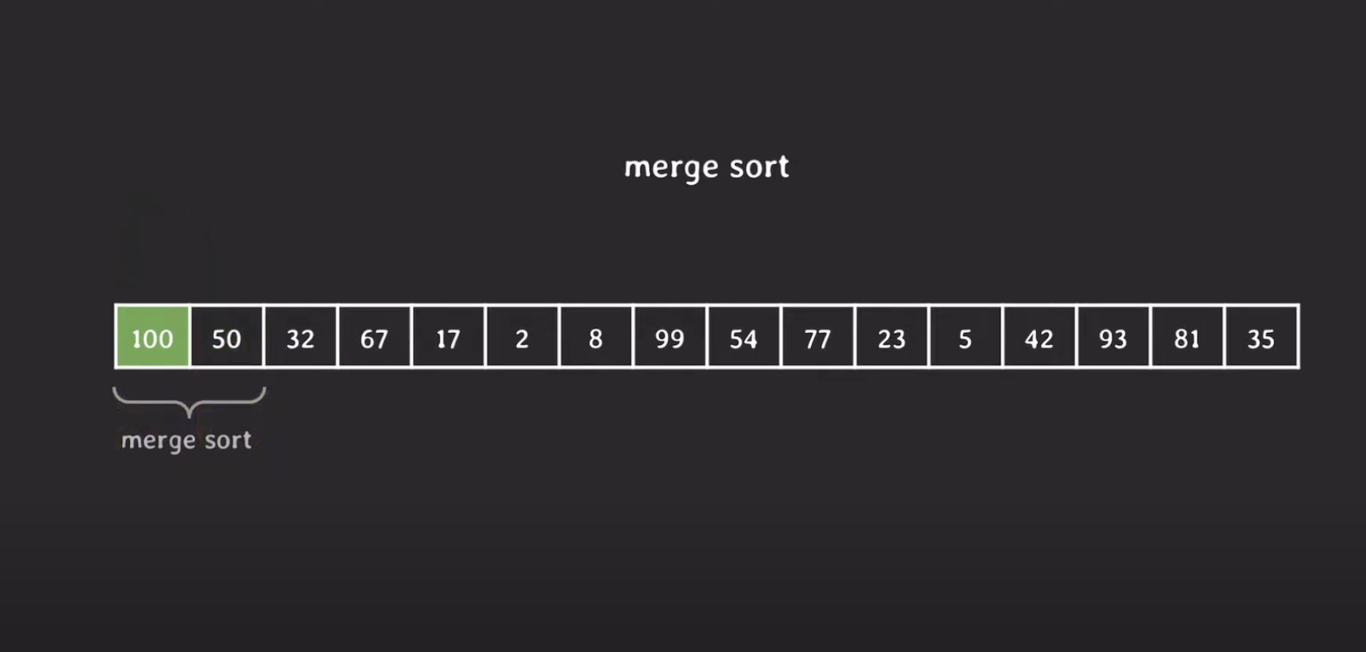 배열을 계속 반으로 분할하다보면 아래 그림처럼 하나의 요소만 남게 된다.(100)