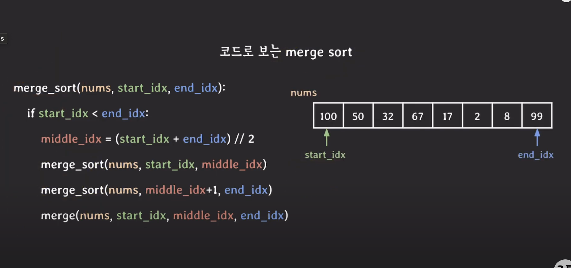 배열을 반으로 나누어 middle_idx를 구한 뒤 앞-서브-문제와 뒤-서브-문제를 재귀적으로 함수를 수행하는 것을 볼 수 있다.