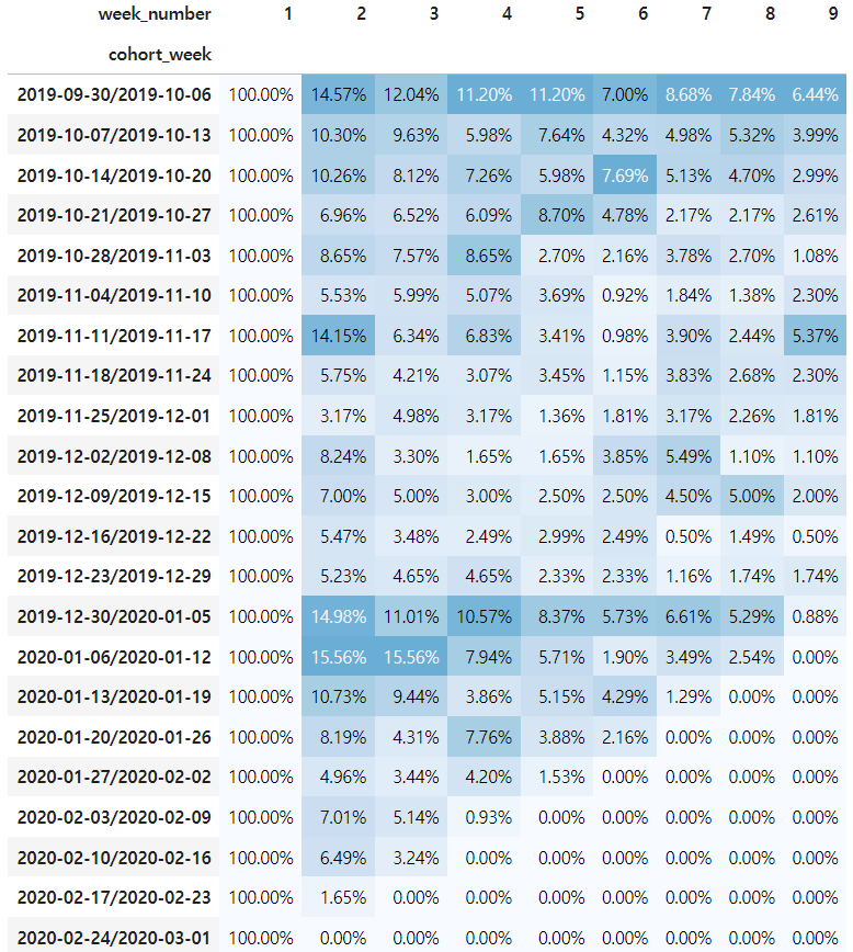 styled_df = retention_rate.style.background_gradient(cmap='Blues', low=0, high=1)