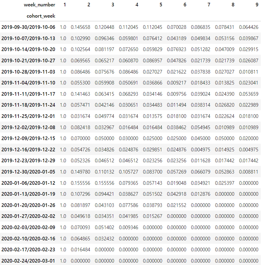 # 첫 주에 속한 사용자 수로 나눠서 유지율 계산