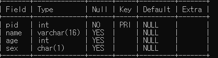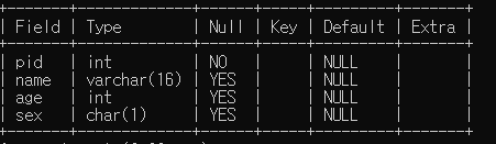 create table person(pid int NOT NULL, name varchar(16),age int,sex char, primary key (pid));