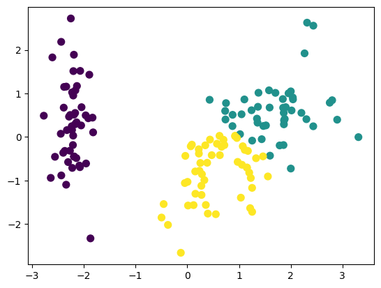 plt.scatter(data['PC1'], data['PC2'], c=y_pred, s=50) # y로 색깔 표현, 원의 크기 50