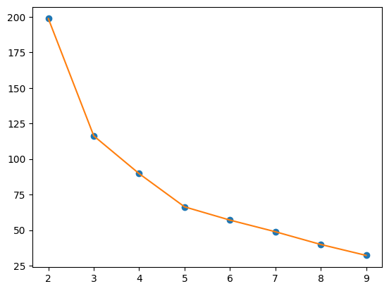 plt.plot(np.arange(2,10), inertia, 'o') # 점을 찍어라