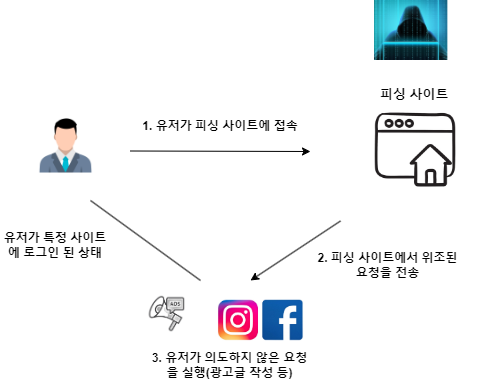 대부분 사용자들은 본인이 자주 방문하는 사이트에 대해 자동 로그인 기능을 사용하기 때문에 피싱 사이트에 접속했을 시 해당 로그인된 사용자 정보를 도용하여 희생자가 본인의 로그인 정보로 위조 요청을 보낼 사이트에 의도치 않은 기능을 실행시키도록 하는 것입니다.