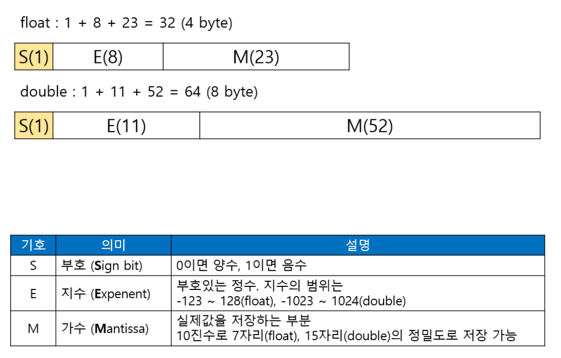 int 타입은 '부호와 값' 두 부분으로 이루어져있지만, float 과 double 과 같은 실수형은 '부호(S), 지수(E), 가수(M)' 세부분으로 이루어져 있습니다.