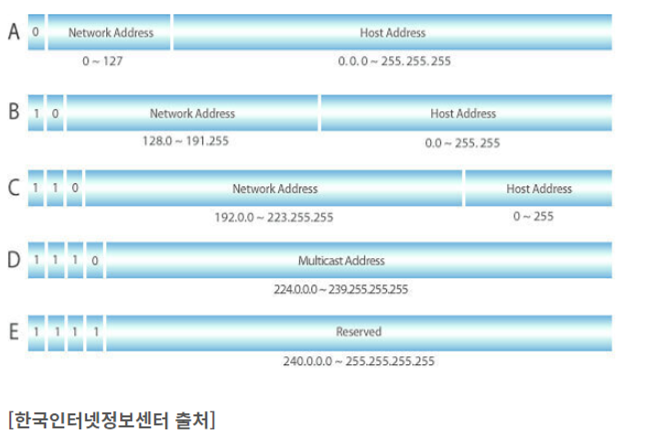 - 0.0.0.0 ~ 127.255.255.255 범위(실제론 1부터 126까지)