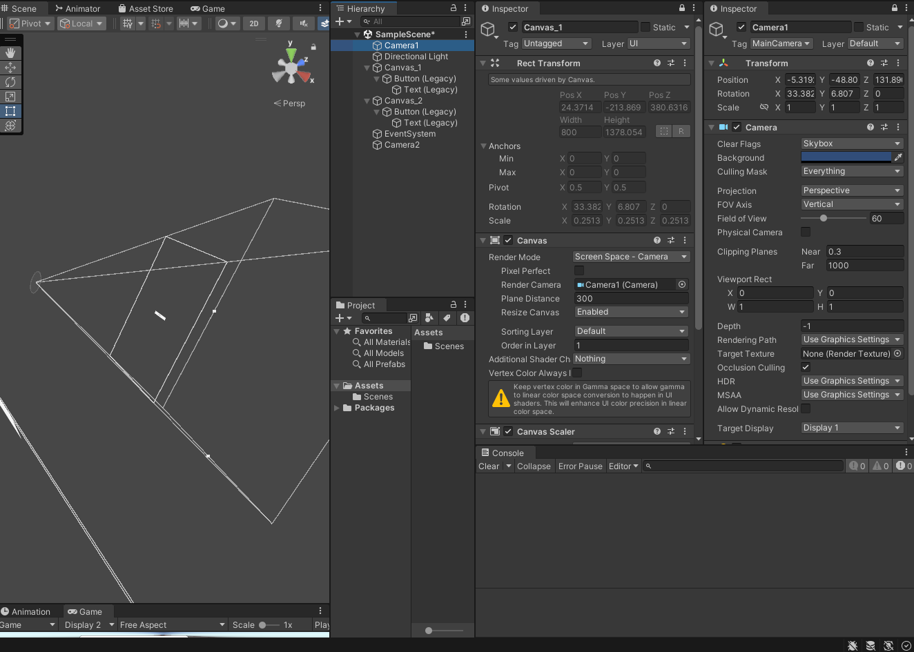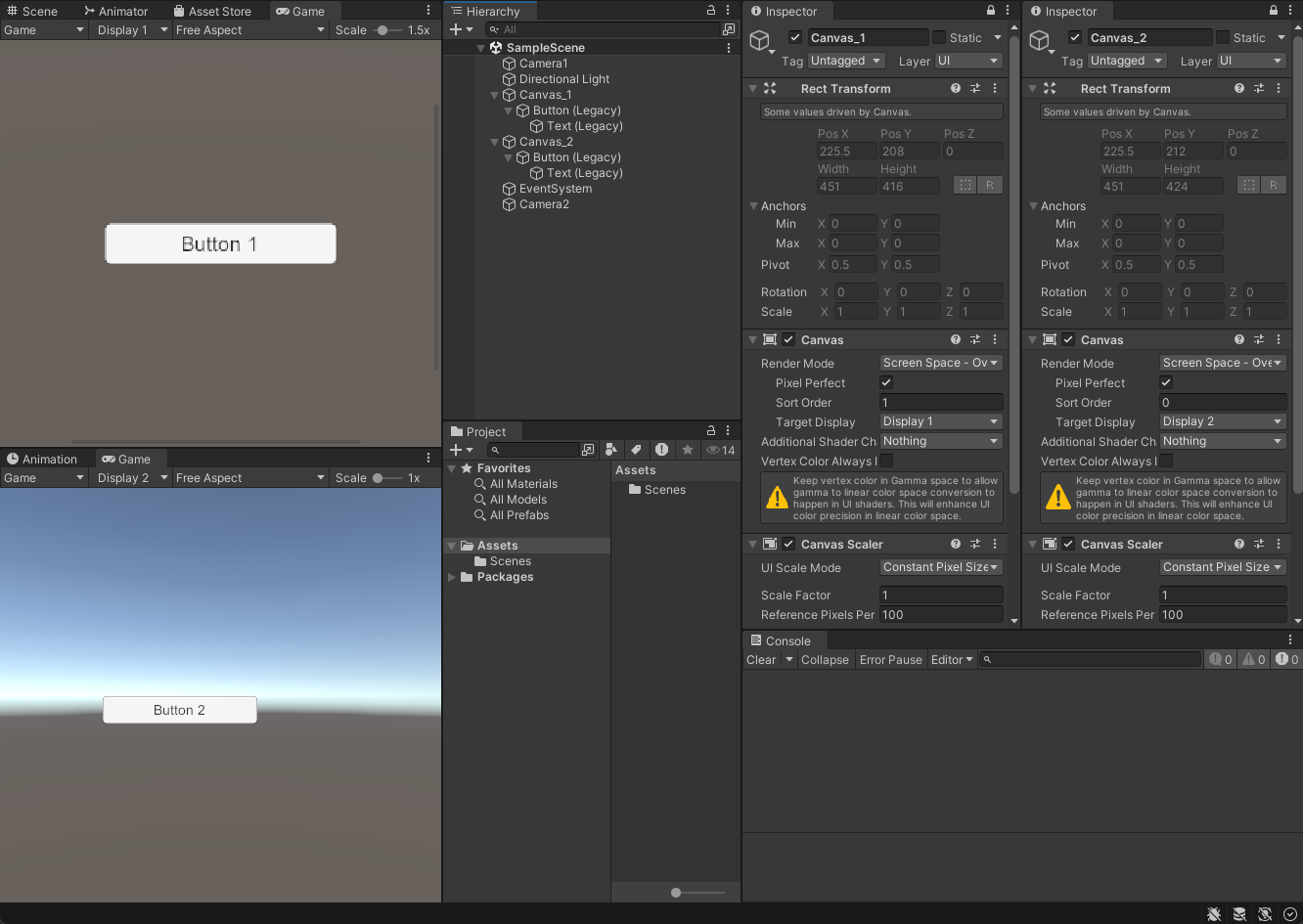 - Camera가 하나가 아닌 2개 이상 일때 Display를 지정해 줄 수 있는데, 마찬가지로 Canvas 또한 Target Display 옵션을 통해 렌더링 하고자 하는 Display를 선택 할 수 있다.