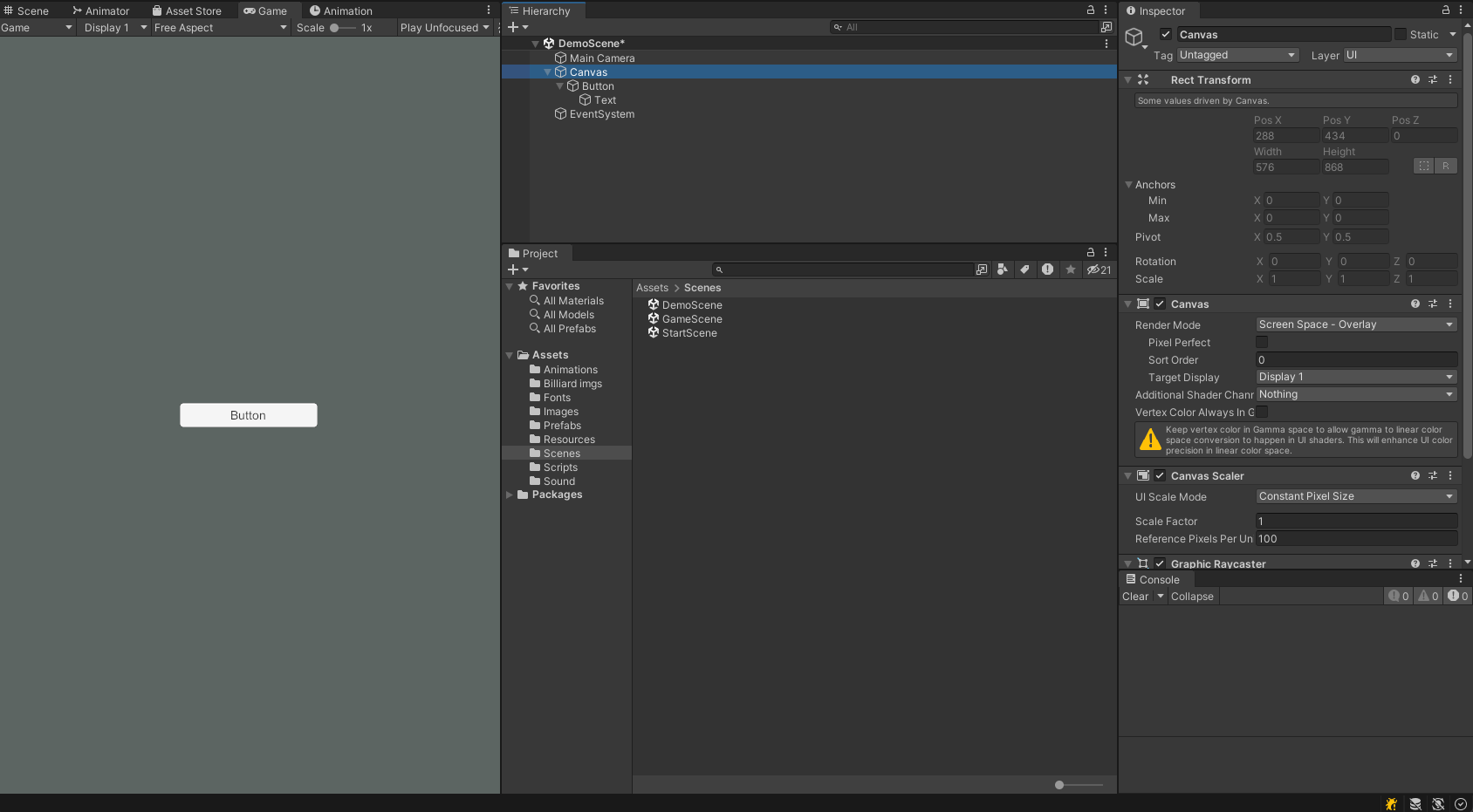 Overlay 로 Render Mode를 사용하게 되면 UI 요소가 화면에서 Scene 위에 렌더링 된다. 그래서 스크린의 크기가 조절되거나 해상도가 변경 되면 Canvas는 여기에 맞춰서 자동으로 크기가 변경되는게 특징이다. 게임화면에서 특별하게 변경 되는 건 없다.