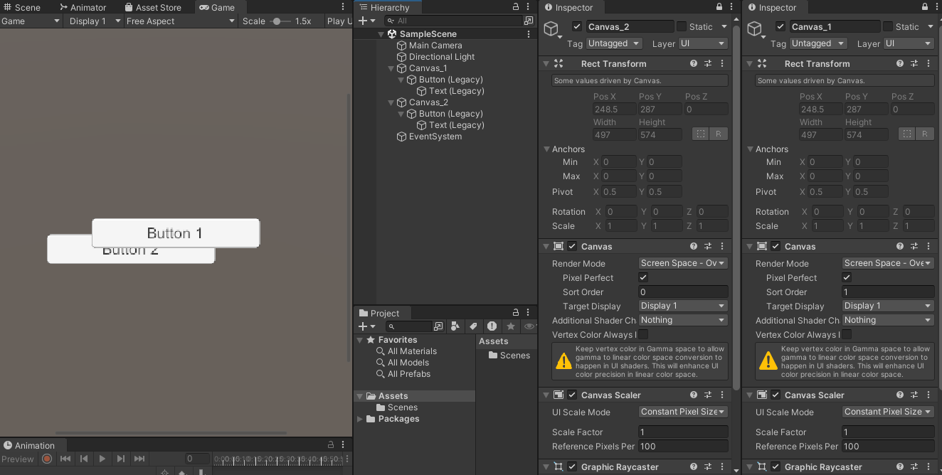 Hierarchy 순서상 Button 2가 위에 표시되어야 하지만 Sort Order를 통해 순서가 바뀐것을 알 수 있다.