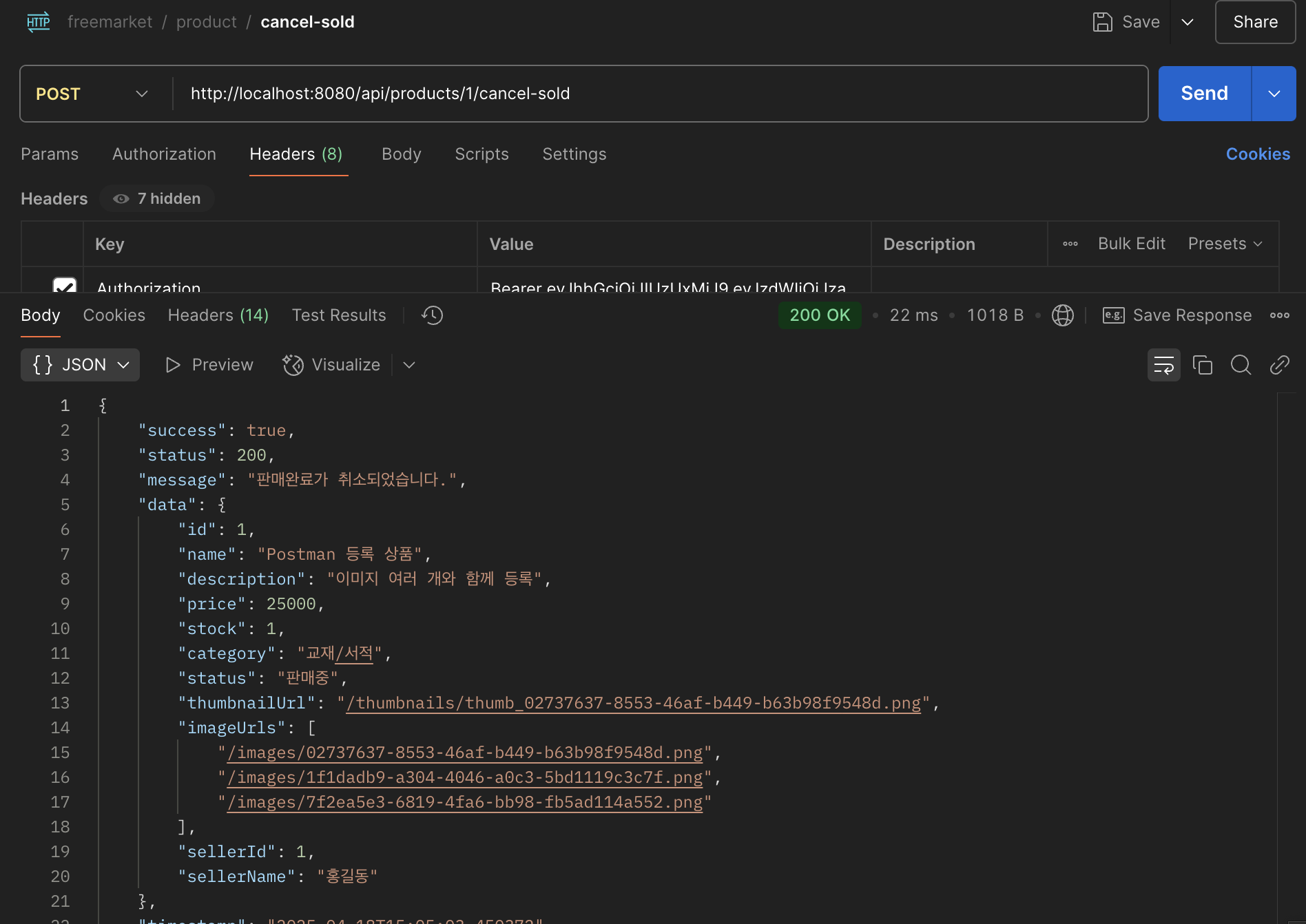 @Operation(summary = "판매완료 취소", description = "판매완료 상태의 상품을 다시 판매중 상태로 변경합니다.")