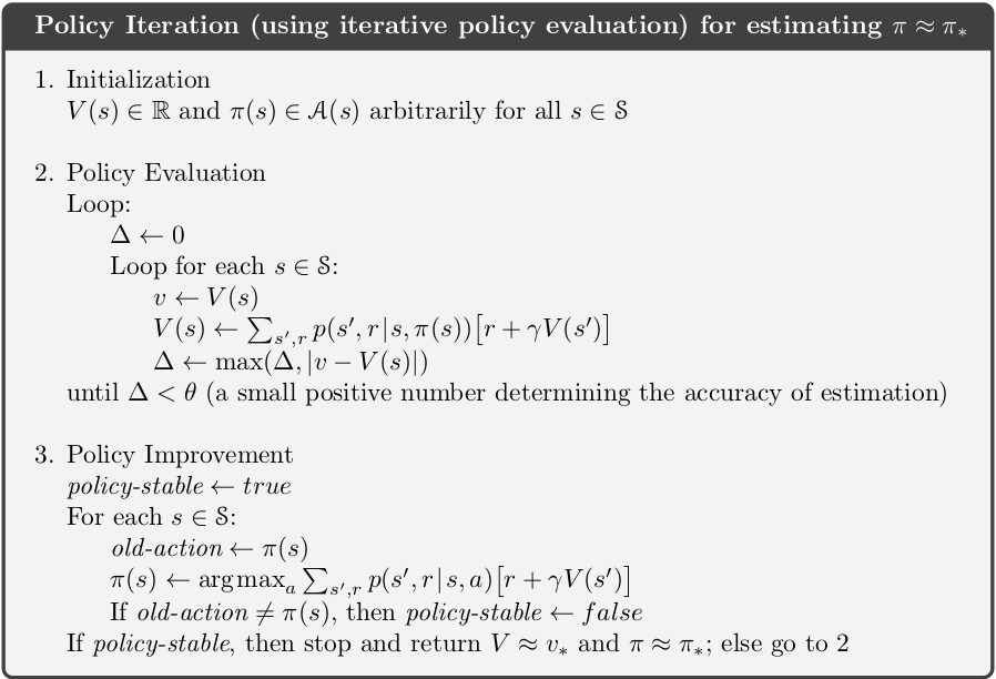 즉 둘을 결합하여 optimal policy를 찾는 과정을 policy iteration이라고 한다.