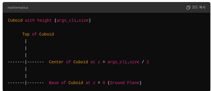 # translation=(0.0, 0.0, args_cli.size / 2) 위치에 직육면체를 생성. 직육면체의 중앙 크기(높이)의 절반으로 설정하면 직육면체의 바닥면이 지면과 완벽히 정렬됨. 중심점을 기준으로 높이가 설정되기 때문임