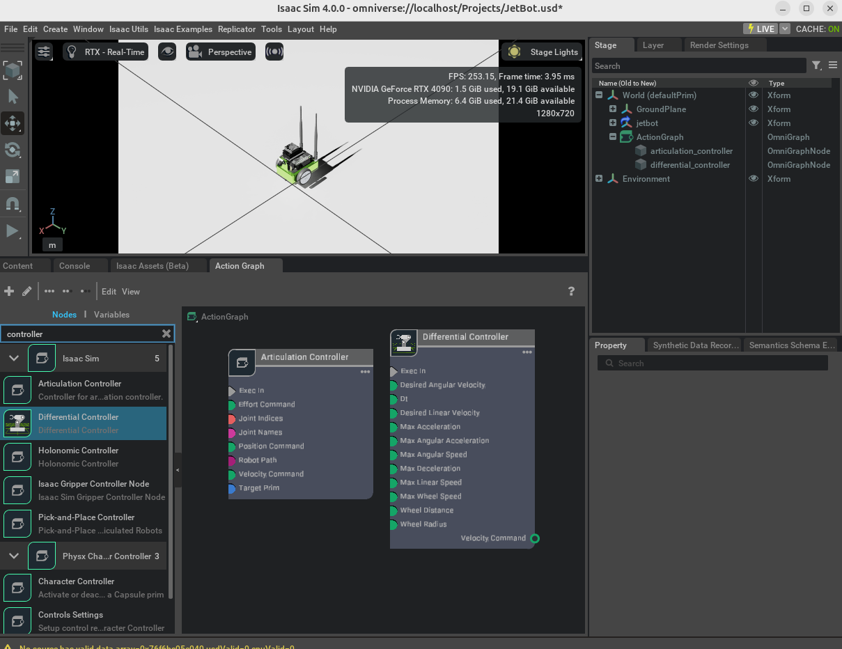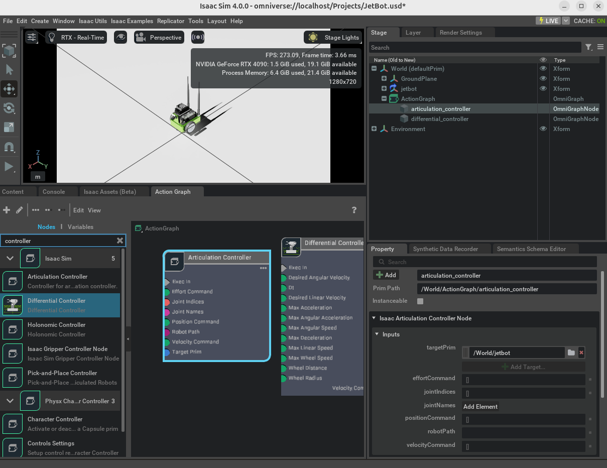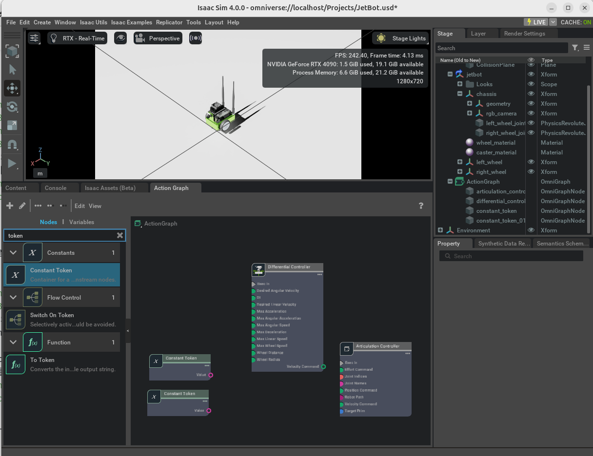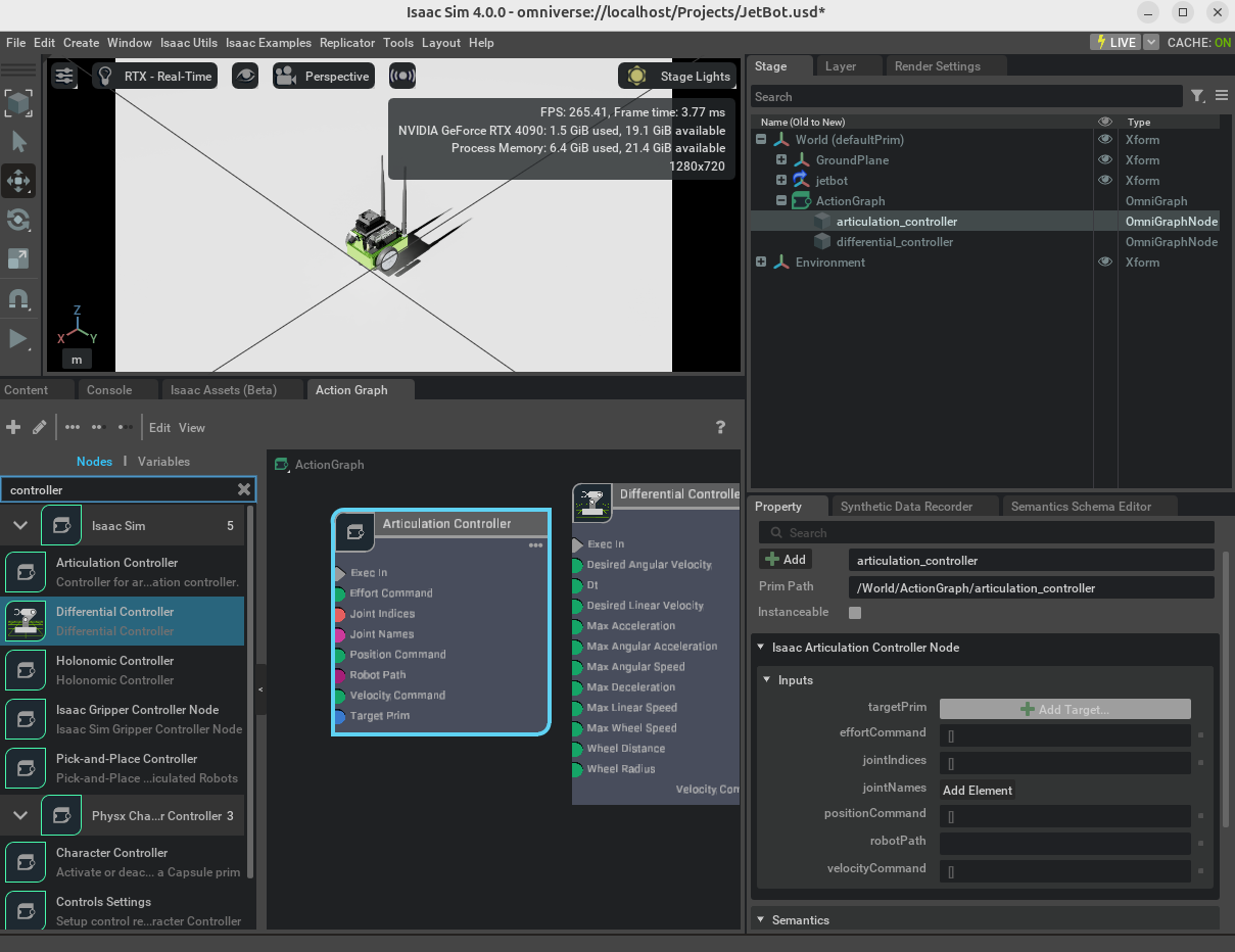Articulation Controller은 어떤 관절을 관절화해야 하는지 설정해줘야 한다. 토큰과 인덱스값으로 이를 설정할 수 있다. 현재 JetBot은 두개의 관절이 존재한다.