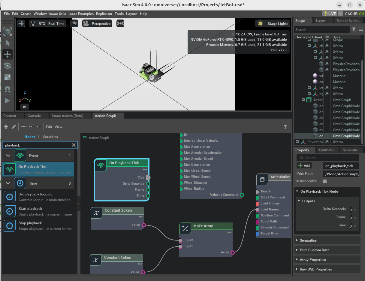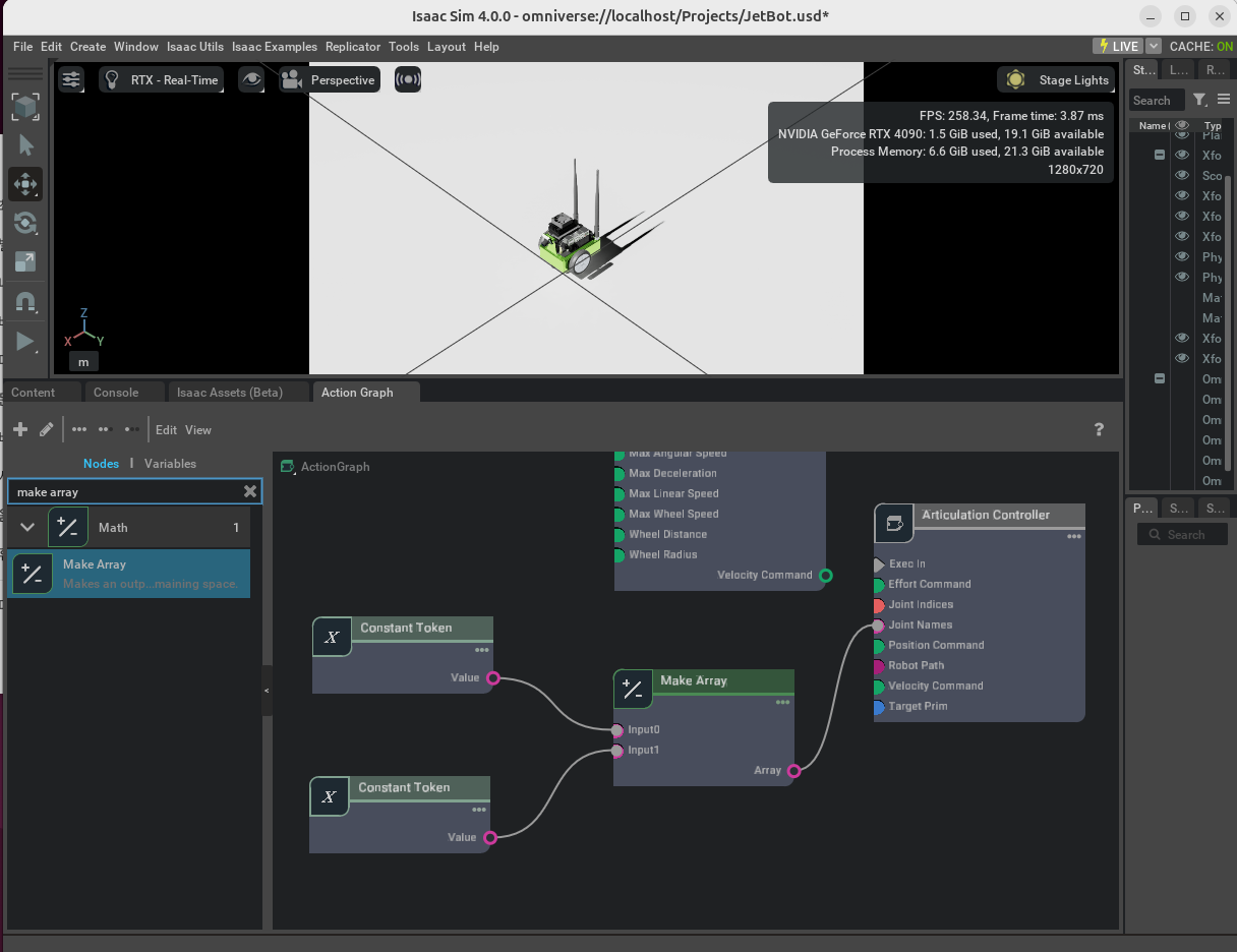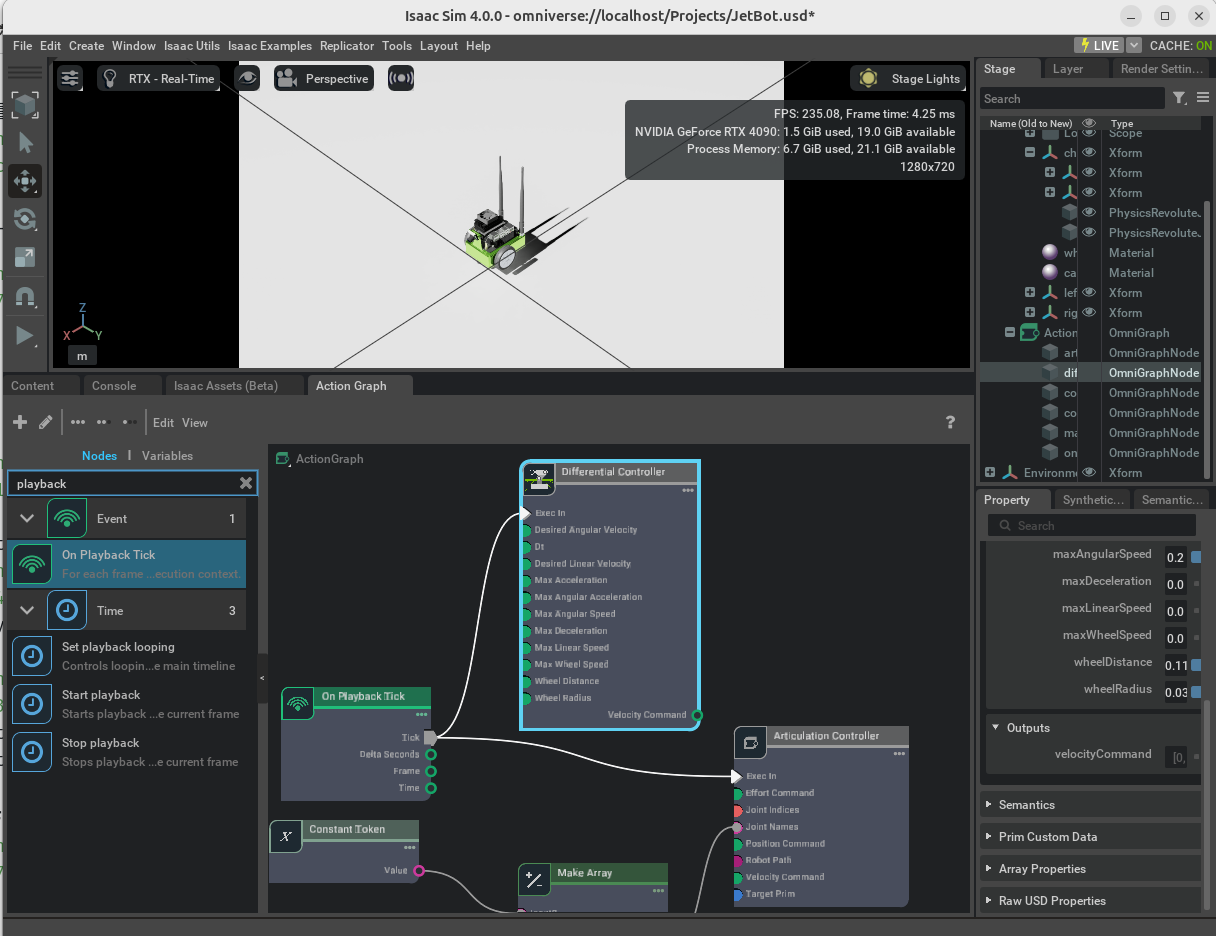 Articulation Controller은 어떤 관절을 관절화해야 하는지 설정해줘야 한다. 토큰과 인덱스값으로 이를 설정할 수 있다. 현재 JetBot은 두개의 관절이 존재한다.