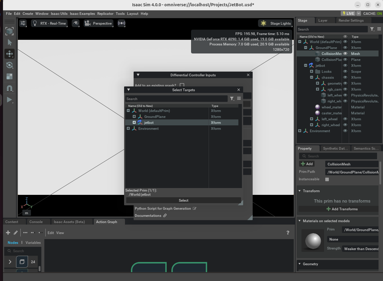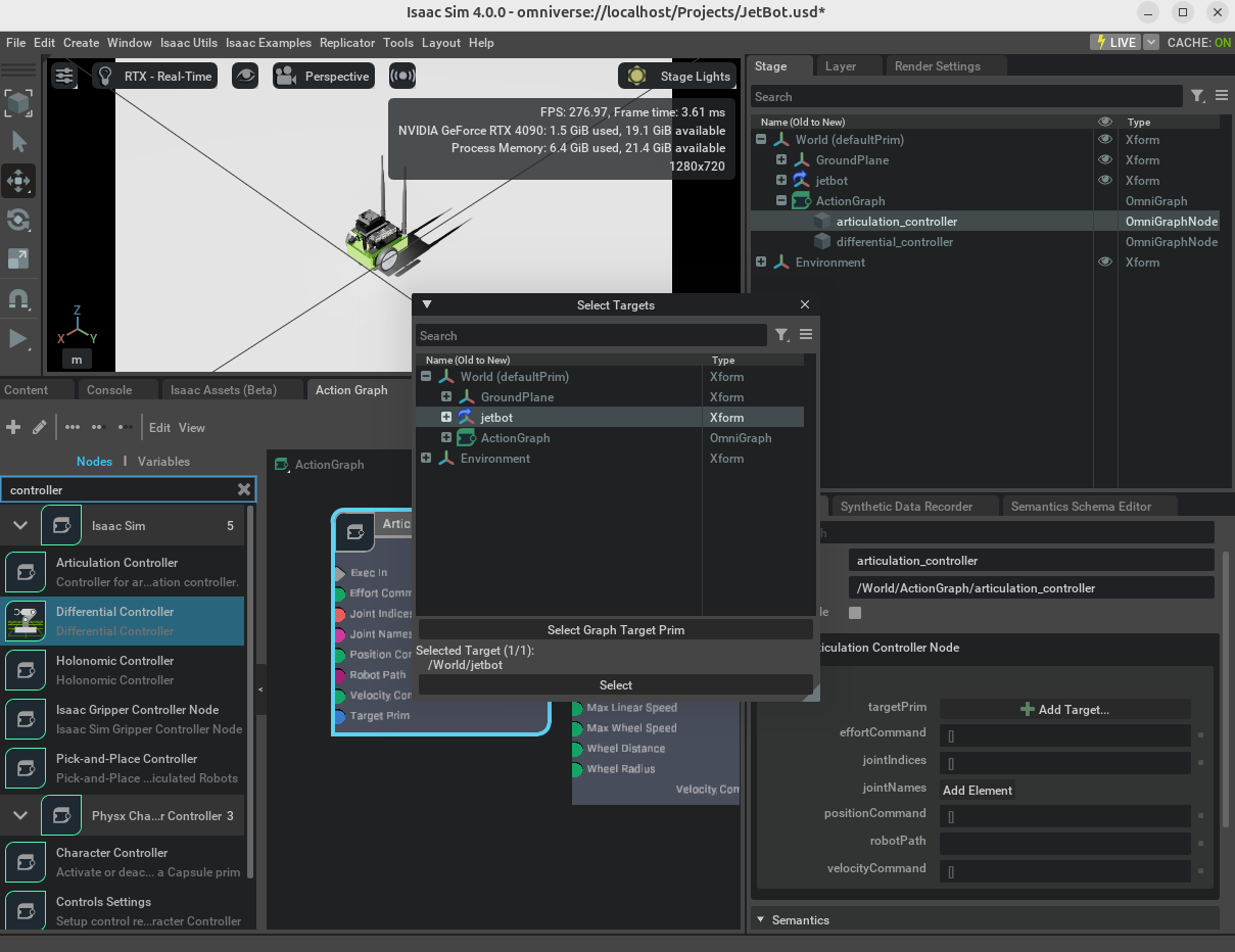 그래프의 Articulation Controller를 클릭 후 property창의 input의 target Prim을 눌러준다. 이후 팝업창의 JetBot을 선택한다.
