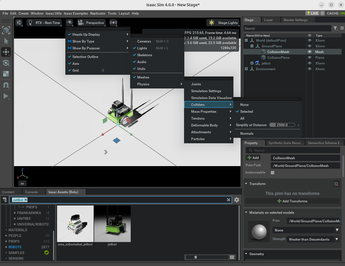 JetBot의 초록색 선을 없애고 싶다면 눈표시 -> Show By Type -> Physics -> Colliders -> Slected를 클릭하면 된다.