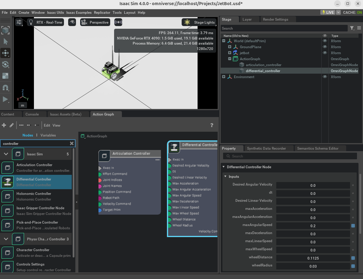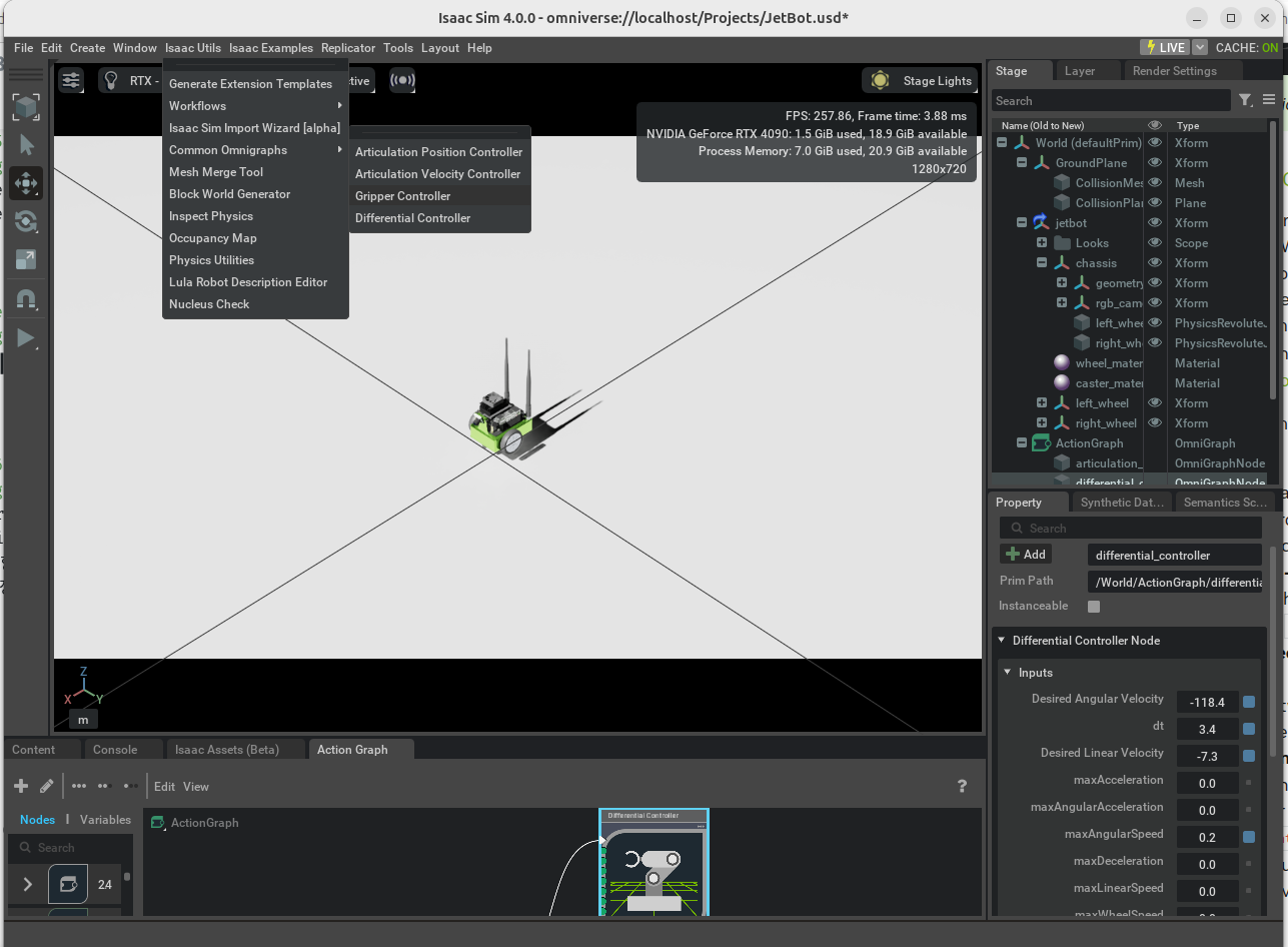 메뉴 막대로 가서 Isaac Utils -> Common Omnigraphs -> Differential Controller를 클릭한다.