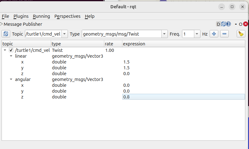 Plugins -> Topics -> Message Publisher를 누르고 Topic 부분을 /turtle1/cmd_vel 로 설정해준다. (우리가 초기에 터미널에 설정해준대로)