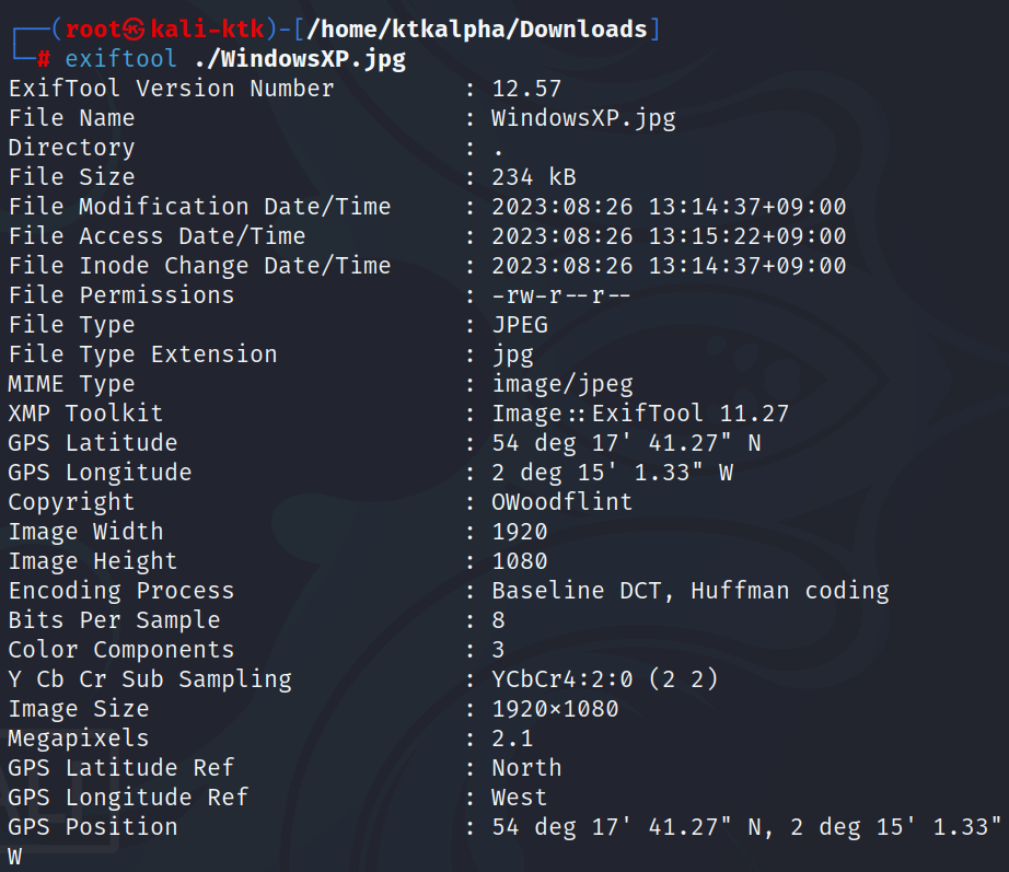 exif는 이미지속 정보 같은 것 인데 exiftool 명령어를 써서 내용을 볼 수 있다