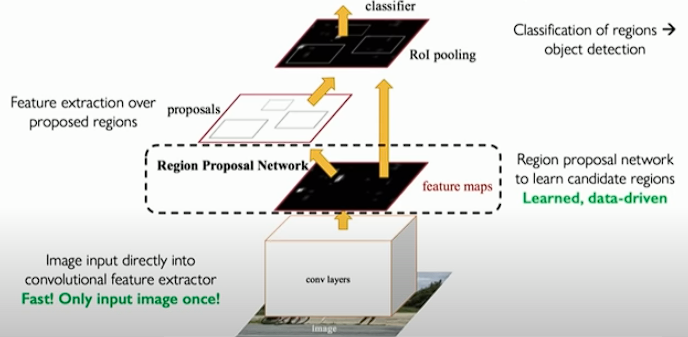 There is improved version of R-CNN(faster R-CNN). A image feed into region proposal neworks. The goal of the networks is to propose certain regions in the image that we should attend to then feed just those regions. In other words, the goal is to learn or extract all of those key regions and process them through later part of the model.
