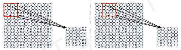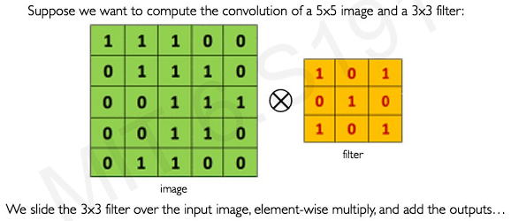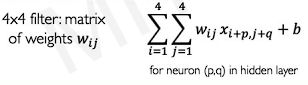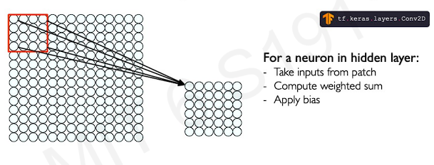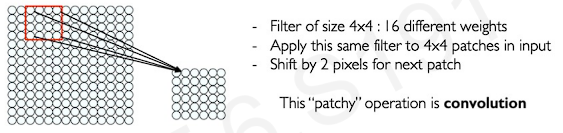 The patch in the picture has 16 different pixels and its weights. Then we use the result of that operation(convolution) to define the state of the neuron in the next layer. After the operation, we move the window(patch or filter) 2pixels for next patch.