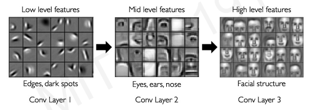 We can see receptive field grows as the dimensionality of filters grow through the convolutional layers. These process is also called as hierarchical decompositions.