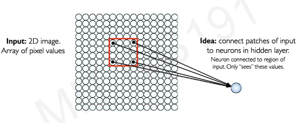 Each neuron in this hidden layer(convolutional layer) is going to be computed as a weighted sum of its inputs applying a bias and activating with a non-linearity(often ReLu). The most important thing in this operation is, every single neuron in this hidden layer only sees a certaion patch of inputs in its previous layer(the image). The next layer, the network will attend to a larger patch and that will not only the red square in the example, but effectively a much larger red square. However, the network will still maintain the ability of detecting in the certain space.