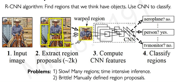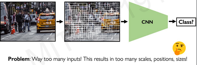 To solve the problem, we take the box where it is high likelihood of having an object might be presented. Then we feed in those high attention locations to our convolutional neural network. But this algorithm still has problems.