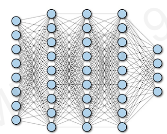 The network has multiple hidden layers, and each neuron is connected to every neuron in its prior layer.