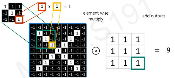 LHS matrix is the weight matrix(the patch) and RHS matrix is the path we are looking to compare it against in our input. And the question is how similar are these two patches.