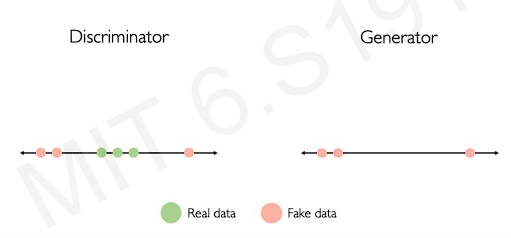 Let's start with 1-D line. The generator will generate fake data on the line. Then, the discriminator sees these points with some real data. Before it is trained. It might not well distinguish which one is real.