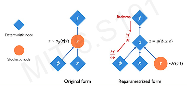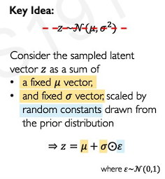 To apply backpropagation to train algorithm, key idea is reparametrizing the sampling layer. We rebuild the vector z(as a latent variable) with fixed vector, and fixed distribution(normal distribution).