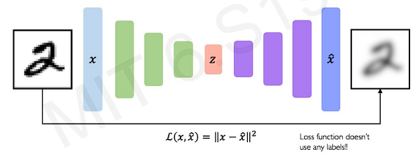 We can compare the pixel wise difference between the input data and the reconstructed output. The thing is, we don't need any labels for loss function. We just need the original input data and the reconstructed output .