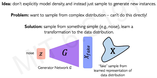 smaple generation : similar to density estimation, but focus more on generaing new instances. The model learns a underlying probability distribution, but then use that model to sample from it and generate new instances.