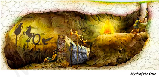 In the figure, the prisoners can only observe shadows of objects on the wall. They can measure the shadows and give names beacuse the shadows are reality to them. But they are unable to directly see the underlying objects the true factors themselves that are casting those shadows.
